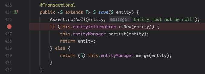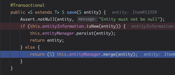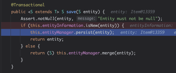 이렇게 했을 때 아까 위에서 본 SimpleJpaRepository의 save()는 어떻게 동작할까?