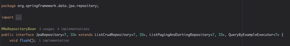 이런 모양으로 생겼다. 참고로, Deprecated 된 메서드도 있다. getOne()이 대표적이다. 그리고 findOne()은 findById()로 변경되었다. 메서드 명이나 이런게 중요한게 아니고 여기서 핵심은 이런 구조를 가지고 있다는 점이다.