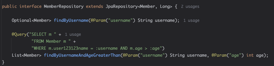 바로, 메서드 시그니처만으로 어떤 쿼리를 사용할지를 유추해서 그냥 해당 메서드 쿼리를 만들어버린다! 예를 들면 다음과 같이 코드를 작성하자.