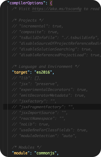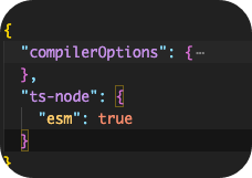 compilerOptions의 module을 commonjs로 target을 es2016으로 설정하고 다음과 같이 ts-node의 esm을 true로 설정한다.