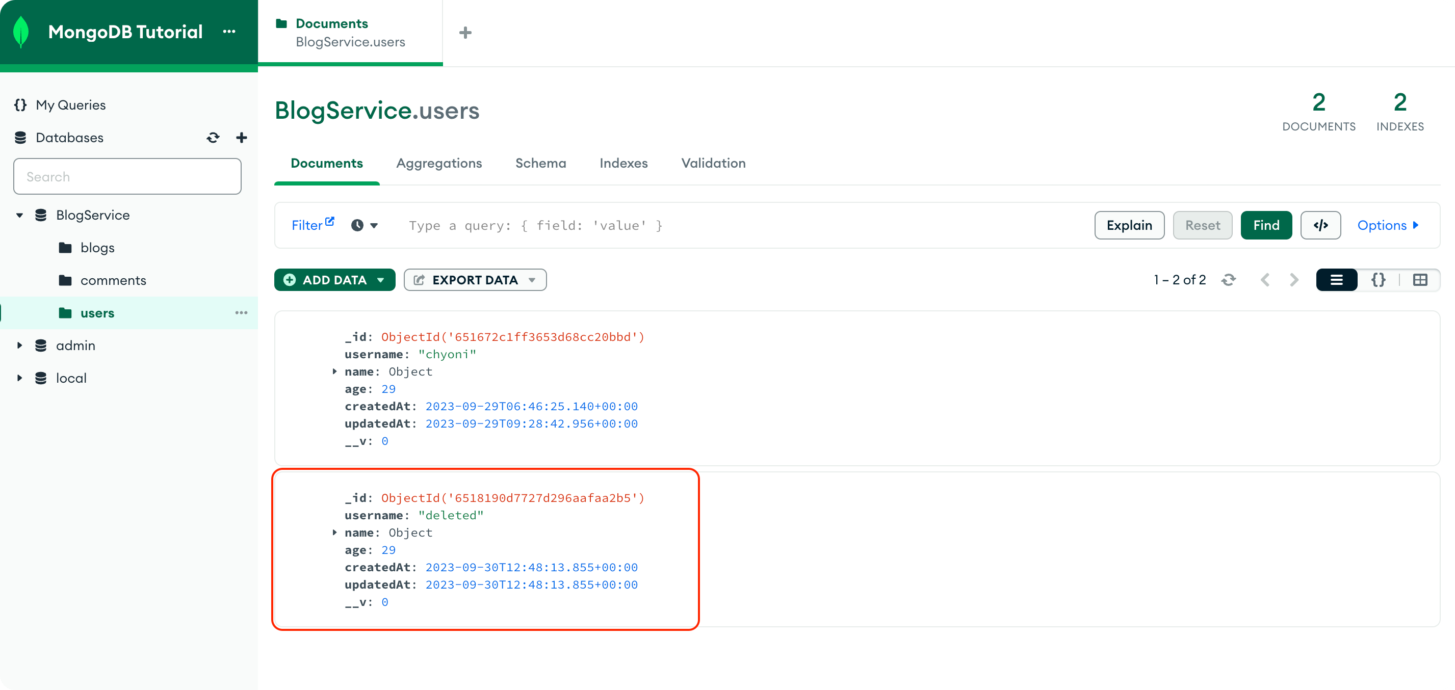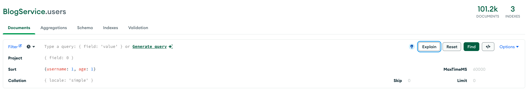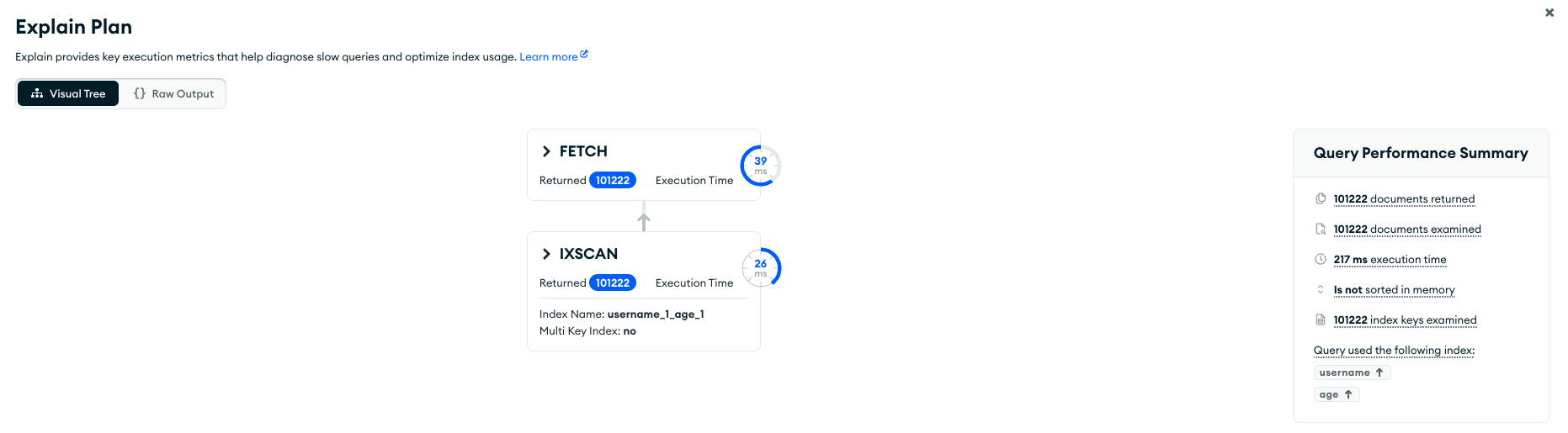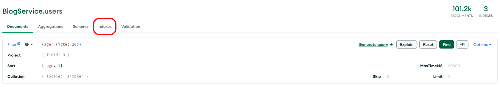 이렇게 age를 오름차순 username을 내림차순으로 설정하고 인덱스를 만들었고 이와 같은 조회를 해보자.
