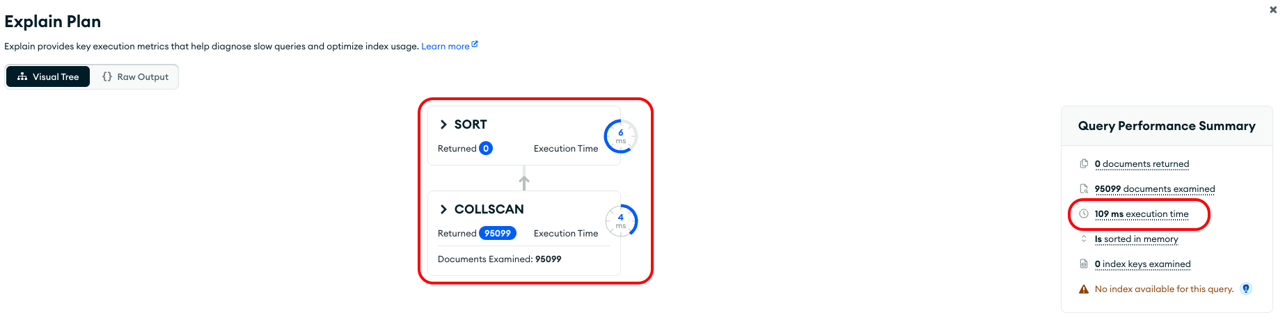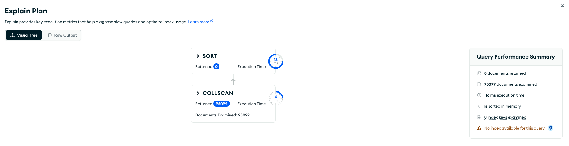 신기하게 이번에는 컬렉션 스캔을 수행했고. 우측에 이용가능한 인덱스가 없다고 표시된다. 왜 그럴까 ?