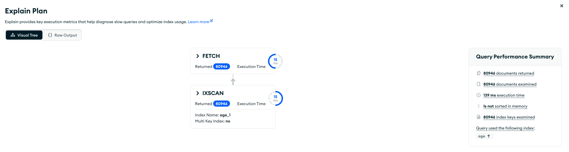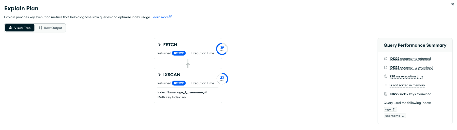 다음과 같이 필터링 조건을 age가 20보다 큰 녀석들로 설정하고, Sort를 age가 오름차순(1) Sort한다는 조건을 걸고 우측 Explain 버튼을 클릭해보자.