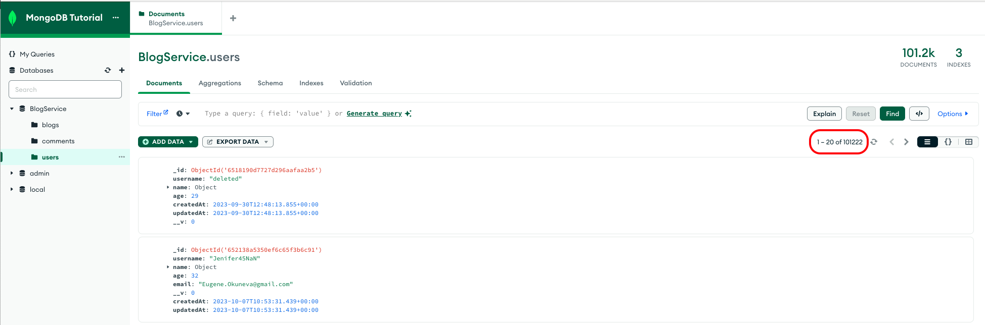 우선 내 DB에 Users라는 컬렉션에는 데이터가 10만개정도가 있다.