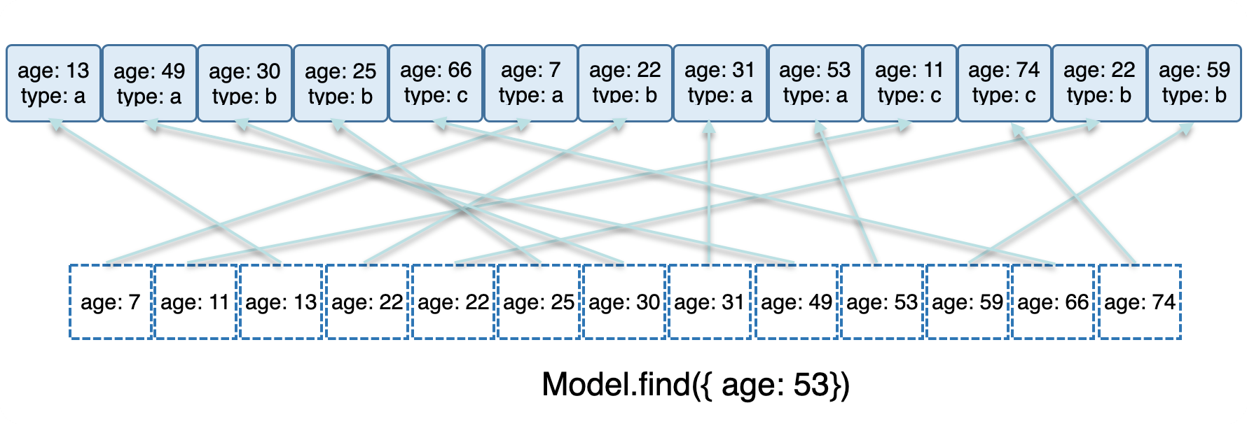 위처럼 특정 Collection에서 age라는 필드에 index를 오름차순으로 걸었을 때를 가정해보자. 만약 그 Collection의 모든 document 중 age가 53인 데이터만 가져오고 싶다는 쿼리를 작성해서 날리면 인덱스 스캔은 위 그림에서 하단 인덱스의 오름차순 데이터를 가지고 데이터를 찾는다. 최초의 시작은 처음부터가 아니라 중간부터 시작해서 중간인 데이터 age:30이 원하는 53인지 판단 후 53보다 작기 때문에 왼쪽 부분은 더 이상 보지 않는다. 그럼 벌써 모든 데이터의 절반이 필터링 된 것이다. 이게 인덱싱 스캔이다. 그리고 찾은 30이 53보다 작기 때문에 우측으로 넘어가서 우측 끝과 30 사이인 53으로 포인터가 넘어간다. 53은 원하는 값이기 때문에 단 두번만에 원하는 데이터를 찾게된다. 이런 방법을 인덱스 스캔이라고 한다.
