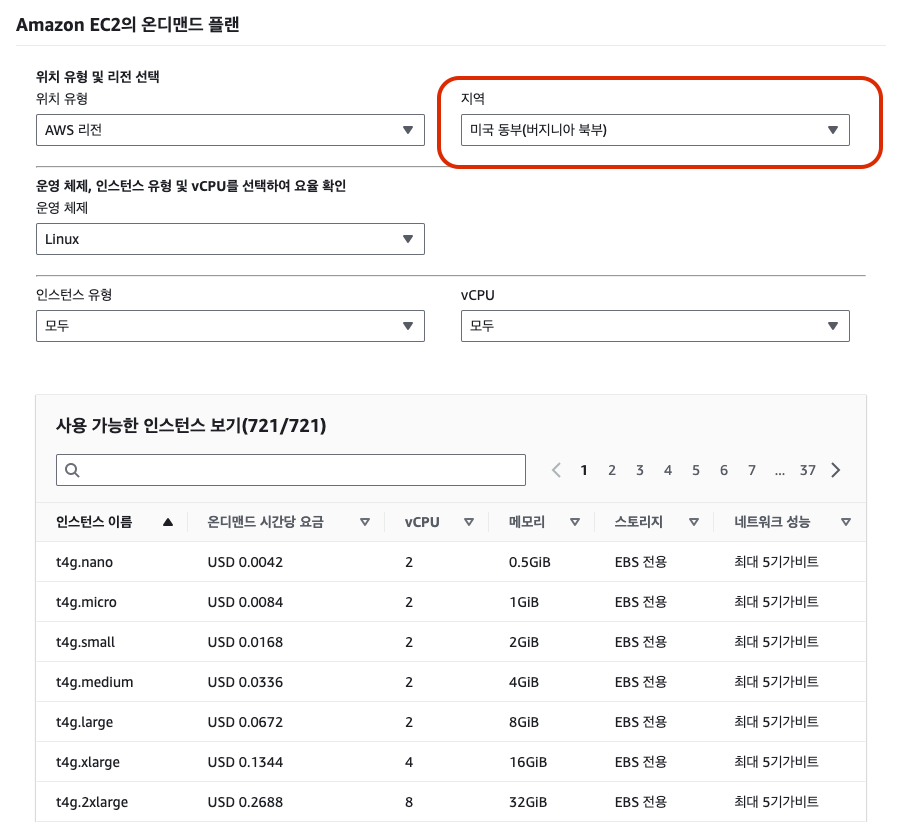 아래 사진은 다음 링크를 참고하자. https://aws.amazon.com/ko/ec2/pricing/on-demand/